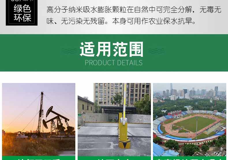吸水膨脹袋廣泛用于防洪搶險(xiǎn),堤壩管涌,河堤堵漏,堤防漏洞、漫溢搶護(hù),防洪堤防的臨時(shí)性加高,臨時(shí)性防水圍城的構(gòu)筑,水庫(kù),江河大堤滲水滑坡,護(hù)坡防沖,工程截流,暗溝和暗洞的堵塞。用于庫(kù)房,庭院,溝塘,被淹耕地排水;用于容易淹水的工廠,隧道,地下停車場(chǎng),地鐵等領(lǐng)域作為防水的使用;用于市政設(shè)施、道路施工,工地橋梁建設(shè),競(jìng)賽場(chǎng)地等積水處吸水去水。是我國(guó)各地水利,水務(wù),防汛辦,防汛物資儲(chǔ)備及市政排水,和城市易澇區(qū)必備的應(yīng)急防汛儲(chǔ)備物資。