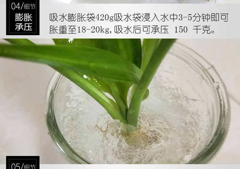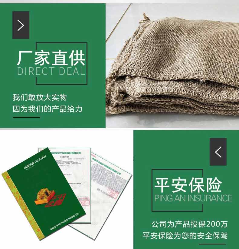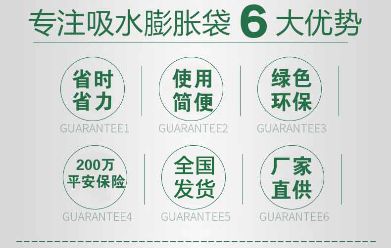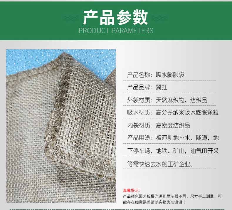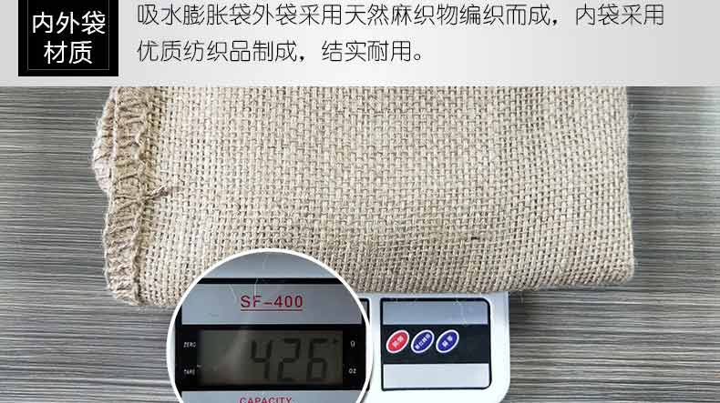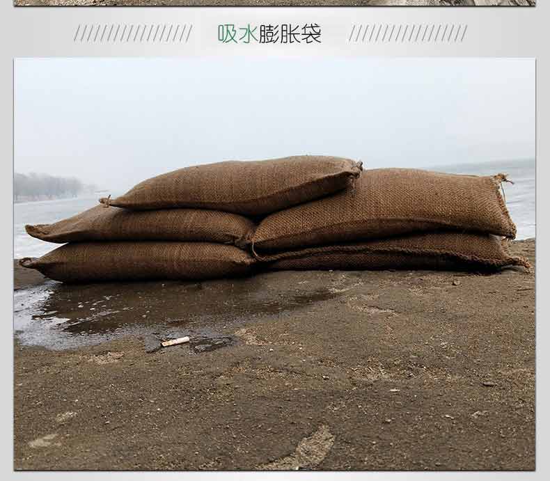 吸水膨脹袋內(nèi)裝的是新型的高分子納米吸水物質(zhì),這種物質(zhì)無(wú)毒、無(wú)味、無(wú)污染,吸水膨脹前為極小的顆粒物質(zhì),吸水后為黑豆大小的含水物質(zhì),干凈且無(wú)公害,待高分子吸水物質(zhì)使用后可用于農(nóng)業(yè)保水抗旱,所以在洪水過(guò)后可就地將袋內(nèi)的物質(zhì)傾倒入農(nóng)田中,在泥土中可完全分解,是綠色環(huán)保、一舉兩得的首選產(chǎn)品。外袋為純麻布和棉布織成,遇水后麻繩可更加結(jié)實(shí)耐磨。