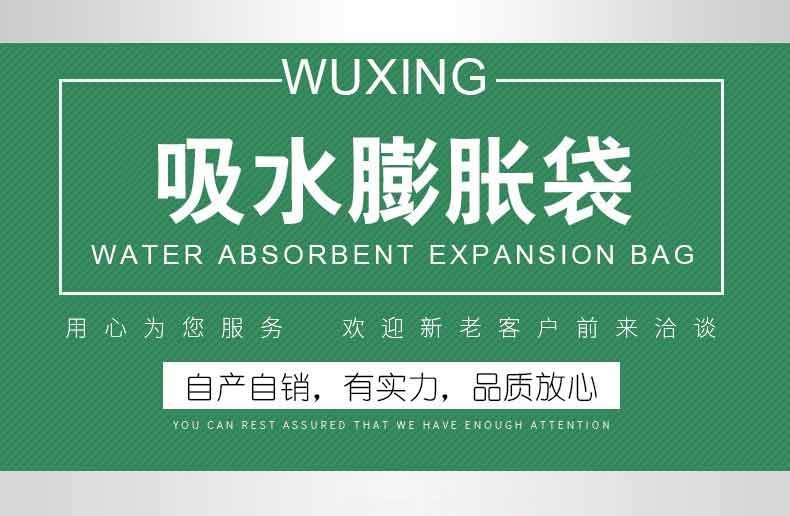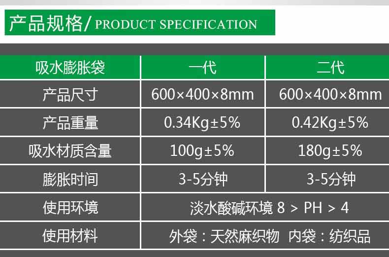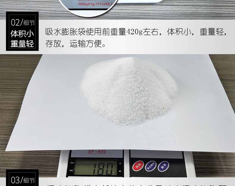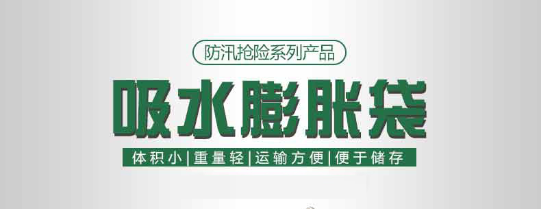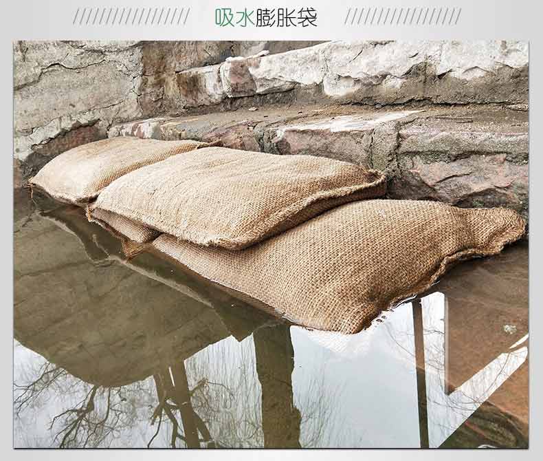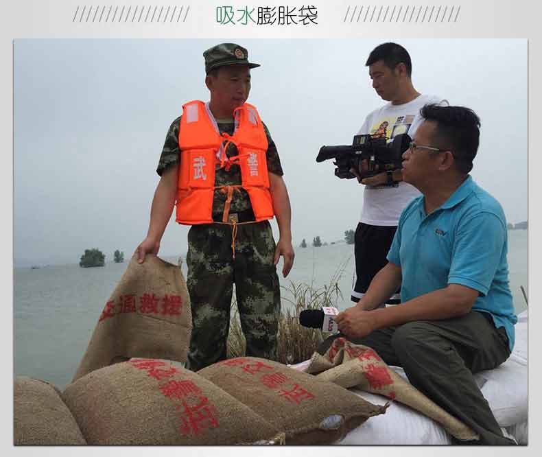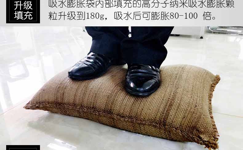 以水治水,快速膨脹,管涌以及快速構(gòu)筑擋水壩,封堵缺口,替代沙袋,替代沙袋和編織袋。操作簡(jiǎn)單,攜帶運(yùn)輸方便,遇水膨脹速度快,浸入水中 3 分鐘即可迅速膨脹至 18 ~ 20 千克,吸水膨脹袋 經(jīng)現(xiàn)場(chǎng)測(cè)試比沙土包堵截速度快9倍,使用時(shí)只需一人就可以完成,勞動(dòng)強(qiáng)度大為減輕,無(wú)毒,無(wú)害,無(wú)味,無(wú)污染,可自然降解